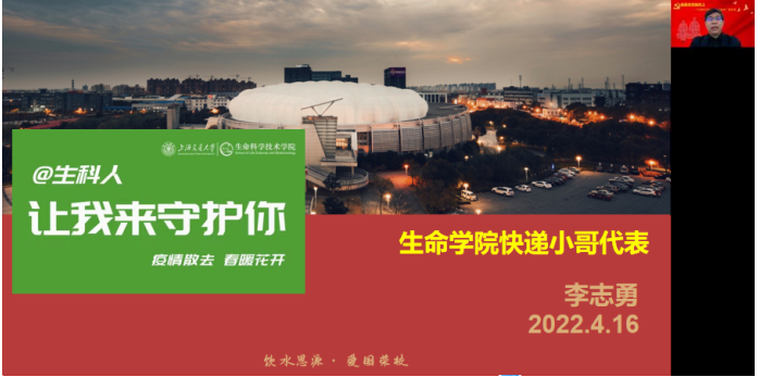 学院副院长、生物工程系李志勇教授分享了他带领“生科院快递小哥”送餐的经历。校园疫情发生后,留院老师用私家车为学生送饭、送物资,组成了一道靓丽的高学历快递“风景线”,昔日教授变身“快递小哥”,准时准点护送学生的一日三餐,为了给学生们送上一顿热饭,老师们设计新的送餐方案,骑上“送餐神器”三轮车……老师们无私奉献的精神深深感染着身边的同学们,鼓舞更多同学积极投身各种志愿者活动中,为抗疫贡献青春力量。