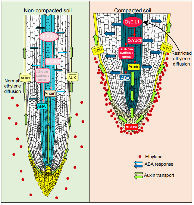 伴随着世界人口的急剧增长,人类对粮食的需求量不断激增,大型机械使用频率逐年增加,导致土壤的硬度逐年变大,土壤板结以及透气性变差。植物在硬度较大的土壤中生长,生长变差、产量降低。因此,人类在作物种植前,不得不进行耕地松土,消耗大量的资源。如何培育能够适应不同硬度土壤的作物新品种,是一个亟待解决的问题。前期这两个课题组进行了联合攻关证实高硬度的土壤可通过限制植物本身产生的乙烯扩散,导致乙烯积聚在根系周围,抑制了植物根系的生长,实现对外界土壤硬度的响应,相关工作于去年发表在Science上(图1)。