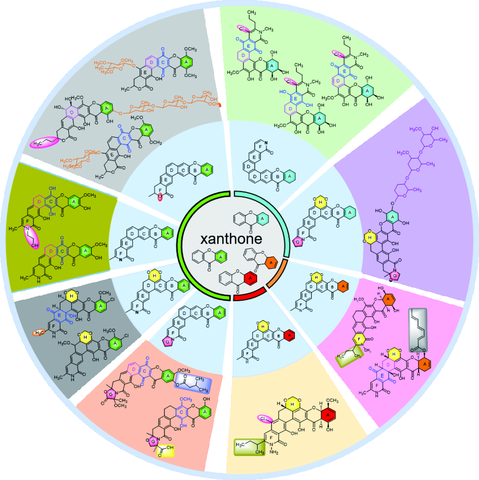 该文从结构多样性出发,根据多环氧杂蒽酮类天然产物分子骨架和多样后修饰的特点,将其分为九类。针对每一类多环氧杂蒽酮天然产物,详尽地比较了其光谱、质谱特征,汇总并分析了可能的化学结构-生物活性相关性,重点阐述了多环氧杂蒽酮类天然产物的生物合成途径和药效基团-氧杂蒽酮环的酶催化机制以及多重氧甲基化和氯代修饰过程。最后对该领域的未来进行了展望,指出综合运用基因组、代谢组、转录组以及蛋白组多组学技术将有助于发现和丰富多环氧杂蒽酮类天然产物宝库。
