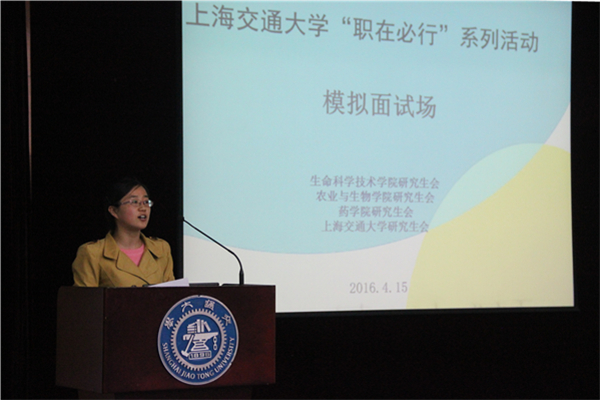 4月15日下午,上海交通大学“职在必行”职业导航系列活动之模拟面试专场在上海交通大学闵行校区生物药学楼树华多功能厅顺利举行。本次活动由上海交通大学生命科学技术学院、农生学院、药学院研究生会联合主办,上海交通大学研究生会协办。求职留学培训机构BeBeyond资深培训师刘颖出席此次活动,作为专业评委为选手做出点评,并针对实际面试提出指导意见。