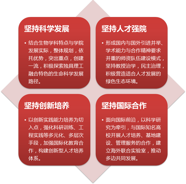 生命科学技术学院将充分利用已有的良好发展态势,配合学校创建“综合型、研究型、国际化”高水平大学的目标,抓住“两个一流”建设和“十三五”谋篇布局的契机,建设一支具有国际视野的高水平师资队伍。以学科和基地建设为抓手,使生物学科在国际上具有一定影响,整体实力稳居于国内前列,若干个二级学科达到国际一流,生物学科进入世界前列。积极筹建生物工程一级学科,促进生物技术成果的产业化,力争生物工程的学科水平进入全国前列。
