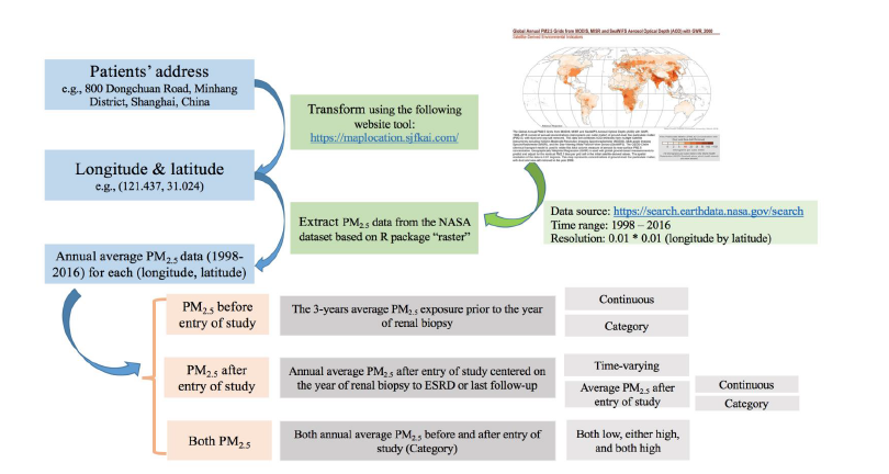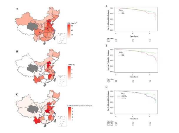 已有报道发现,环境污染作为最为关注的公共卫生问题,与慢性肾脏疾病(Chronic Kidney Disease,CKD)的发生和进展至ESRD极其相关,带来全球经济和医疗的巨大负担。且大气污染物的动物实验发现,PM2.5与肾脏血流动力学改变、肾血管损伤、氧化应激加重和炎症反应有关,最终导致肾脏疾病进展。目前,尚不清楚PM2.5是否会增加肾脏疾病进展高风险(如IgAN)患者的ESRD发生风险,且既往相关研究大部分是横断面研究,缺乏多中心的长期随访数据以佐证。