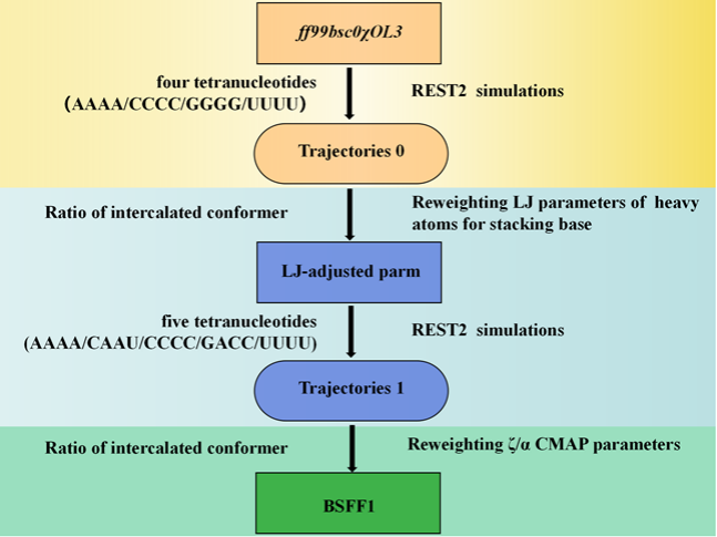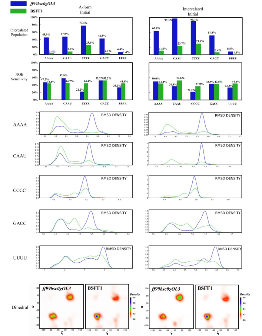 RNA作为中心法则的中心一环,在多个生理过程中都发挥了至关重要的作用,当前肆虐的新冠病毒也是一种RNA病毒。当前,人们对于RNA的研究远不如蛋白质的研究成熟,传统实验方法在解析RNA结构上也存在诸多困难,目前已解析的RNA结构数量(<6000)远小于蛋白质(>190000)。在此背景下,能够在原子层面研究生物大分子结构与动态变化的分子动力学模拟就成为了研究RNA的重要方法。然而,决定其精度的RNA分子力场仍存在较大不足,包括诸如过度稳定碱基堆积、zeta/alpha二面角表征失准、以及在模拟四核苷酸体系时容易产生错误的插层结构等问题。