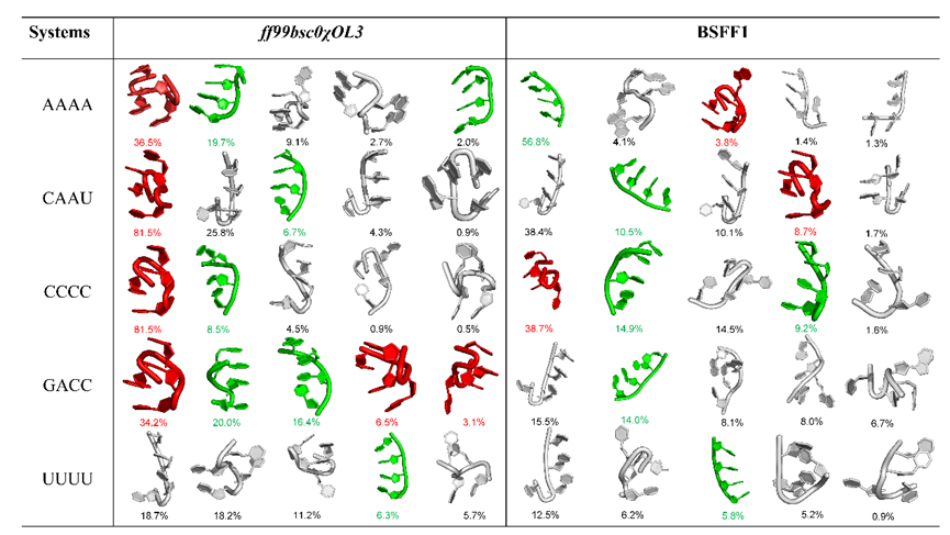 通过对于多个RNA常见体系如短单链、核糖开关、双螺旋、假结、k-turn等的模拟测试显示,该碱基特异性的RNA分子力场BSFF1能够稳定其实验结构。增强采样的结果显示,BSFF1能够将典型的RNA发夹(hairpin)进行从头折叠,将其从单链形式依序折叠为发夹形式,这进一步验证了BSFF1的全局合理性,同时对于研究RNA从头折叠以及核酸分子机制都有着先导提示作用。