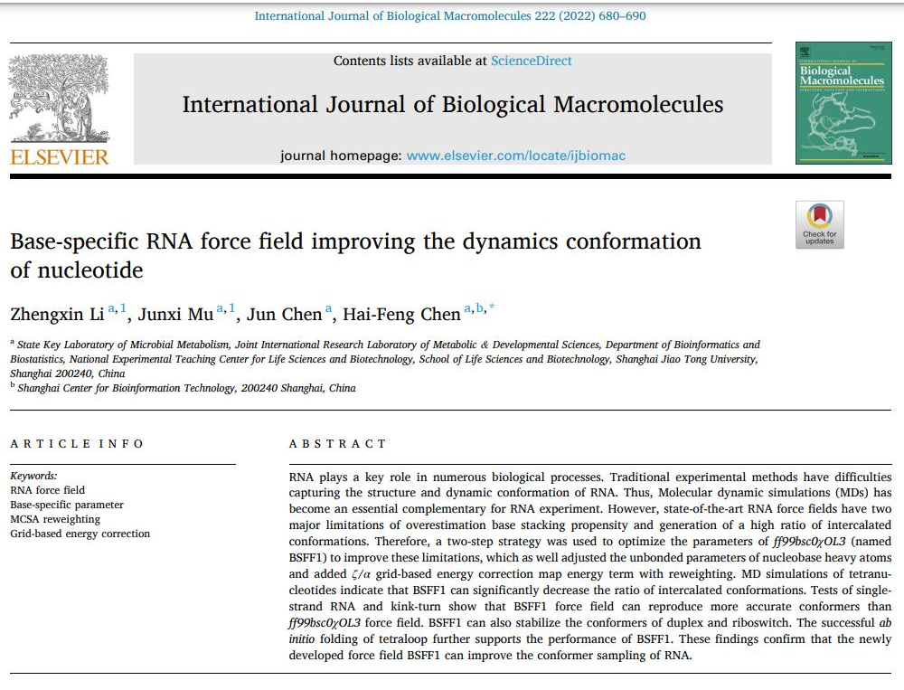 近日国际知名期刊International Journal of Biological Macromolecules在线发表了上海交大陈海峰教授课题组题为“Base-Specific RNA Force Field Improving the Dynamics Conformation of Nucleotide”的最新研究成果。该研究提出了一套碱基特异性的RNA分子力场(BSFF1),有效的提升了针对核酸的模拟效果。上海交通大学生命科学技术学院博士生李政新为该文章第一作者,生命科学技术学院本科毕业生穆俊羲为共同第一作者,陈海峰教授为通讯作者。