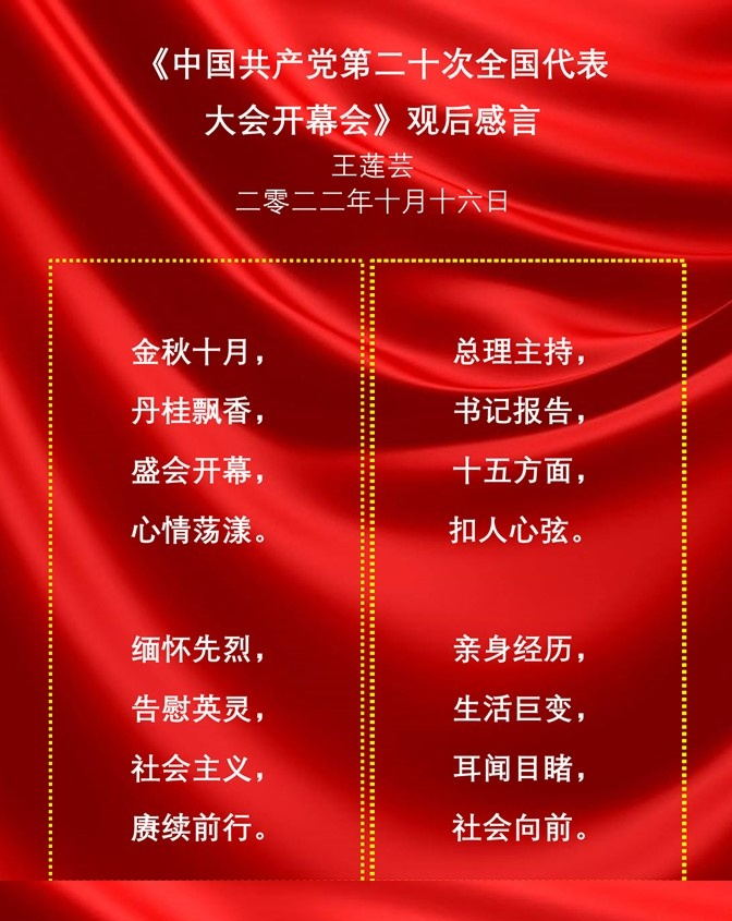 中国共产党第二十次全国代表大会的胜利召开,让人欢欣鼓舞。我认真聆听了习总书记所作的大会报告,令人振奋,感想有三:一是,中国共产党人始终不忘初心,牢记使命的坚守和担当,带领全国各族人民努力奋斗,创造了非凡成就。习总书记在报告中说,过去的十年我们经历了三件大事,其中之一完成脱贫攻坚,全面建成小康社会的历史任务,实现第一个百年奋斗目标。全国有832个贫困县全部摘帽,近一亿人农村贫困人口实现脱贫,历史性的解决了绝对贫困问题,为全球减贫事业作出了重大贡献。数字的背后,更彰显希望和力量,使我们坚信,只有中国共产党的领导,只有社会主义制度才能将不可能的事情变成可能。二是,习总书记在报告中谈到了未来五年及更长远的党和国家事业发展的目标任务以及新思路,新战略,新举措。蓝图宏伟,任重道远。相信在以习近平同志为核心的党中央领导下,一定会让中国人民过上更美好的幸福生活。身为共产党员,为党感到自豪,为党的新征程加油。其三,报告中谈到实施科教兴国战略时,要坚持为党育人,为国育才。曾在大学工作的我们这些老党员,有责任为党做些力所能及的工作。退休后这十年来,我一直受聘于学校组织部特邀党建组织员一职,为青年大学生教育和党员发展工作,尽力而为。我会继续努力,做合格党员,为党增光。