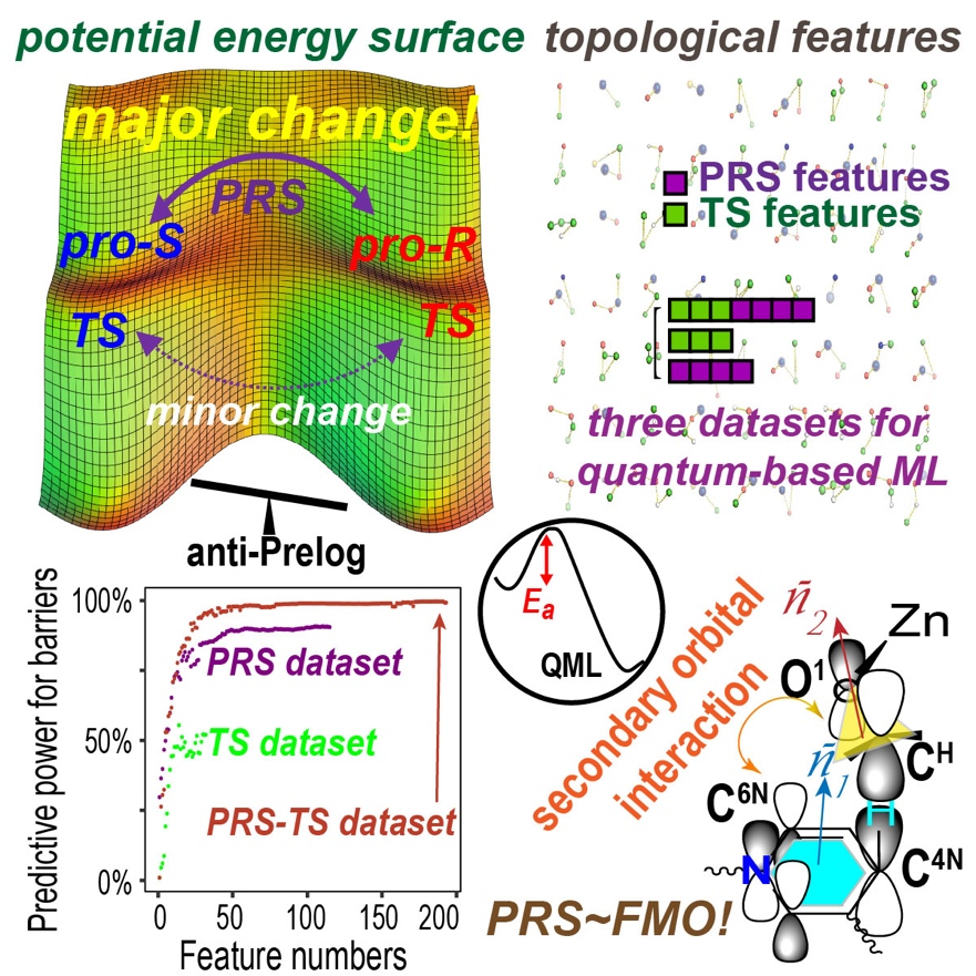 酶催化立体选择性预测在科学工程计算上是一个重大的挑战,它需要在高度复杂大分子系统中用高阶量子力学方法测算不同反应途径之间的微小差别。基于预反应态的快速分子动力学模拟方法已经广泛用于酶催化活性的分析,然而人们在如何选择近进攻构象NAC的预反应态拓扑参数上长期存在各种争议,急需在理论上突破过渡态和预反应态二者对酶催化活性的定量化效应。该课题组基于与江南大学生物工程实验室聂尧课题组长期合作中酶工程科学计算的积累,选用了反应机理清晰可靠、残基突变实验数据丰富、生物工业生产应用广泛的醇脱氢酶CpRCR为研究切入点,利用伞形采样分子动力学预反应态模拟中获得的pro-R和pro-S活性构象,在上海交通大学高性能计算中心展开规模化量子力学计算,通过QM/MM结构数据驱动方法,构建了基于“预反应态-过渡态”联合数据、具有99.6%解释力的高精度人工智能机器学习模型。而后采用相同的建模流程分别构建了基于“预反应态”或“过渡态”独立数据集的两个QML对比模型,发现PRS-QML的酶活预测能力高达90.7%而TS-QML的酶活预测能力只有55.4%,成功地说明了在生物合成酶残基突变和底物改造等实际应用场景中预反应态模型预测具有压倒性的优势。作者进一步利用前线分子轨道理论说明QML模型中所富集到的结构拓扑参数与主-次级轨道相互作用的相关性,阐明了蛋白质工程对酶催化反应势能面的影响主要集中在预反应态区域的变化,而在生物合成酶在天然或人工进化中过渡态区域已经高度优化并相对稳定。