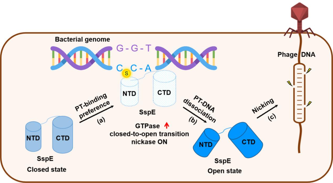 DNA磷硫酰化修饰包括两种类型:由dndABCDE基因簇编码的蛋白介导的双链I型修饰和由sspABCD基因簇编码的蛋白介导的单链II型修饰。SspE是由sspABCD基因簇近旁的sspE基因编码的一个核酸酶,长度为700-800氨基酸,由有GTPase活性的N端结构域(NTD)和有缺刻核酸酶活性的C端结构域(CTD)组成。