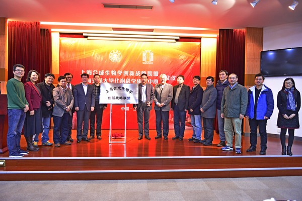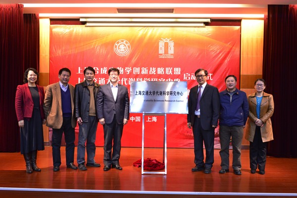 杨胜利院士、赵国屏院士、尹邦奇主任、胡近副书记在各家联盟单位代表见证下为上海市合成生物学创新战略联盟揭牌,胡近副书记、邓子新院士在我校生命科学技术学院、农生学院、药学院的领导见证下为上海交通大学代谢科学研究中心揭牌。