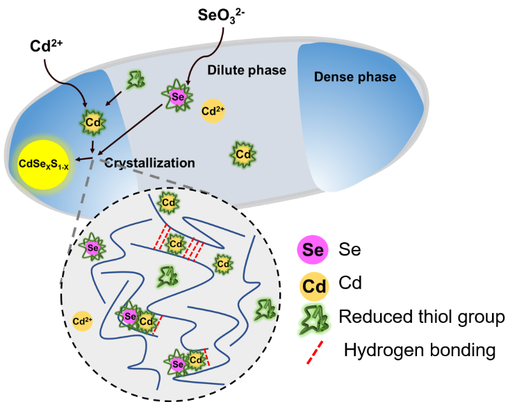 夏小霞课题组在前期研究中发现,异源表达的蜘蛛丝等结构蛋白通过液-液相分离在大肠杆菌胞内形成“液滴样”的无膜区室(Nat. Chem. Biol. 2020, 16: 1143-1148),进而推测蛋白质有序凝聚的特性可能有利于量子点的成核、生长及成熟。以CdSexS1-x为模式量子点,研究表明蛛丝蛋白能支持量子点在大肠杆菌细胞两极的生物合成(以“点亮”细胞的荧光进行表征),而且特定的β-折叠形成能力对于蛛丝蛋白发挥模板作用极为关键。进一步的机理研究表明,转运至细胞内的前体镉离子可与蛛丝蛋白结合,诱导蛛丝蛋白从无规卷曲向β-折叠二级结构的转变,进而招募含硫还原剂并通过氧化还原反应在区室内合成量子点。这不仅巧妙地“隔离”量子点合成过程减少了对宿主细胞的毒性,而且显著提升了目标量子点的合成效率和荧光寿命,体现了活细胞内限域合成的独特优势。