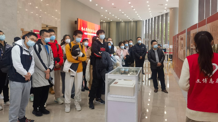 活动开始,师生一行赴文博楼沉浸式参观学习“伟大精神铸就伟大时代”——中国共产党伟大建党精神专题展。同学们驻足在一座座展板前,透过图文并茂的介绍,串联起在伟大建党精神引领下党和人民的百年奋斗征程。
