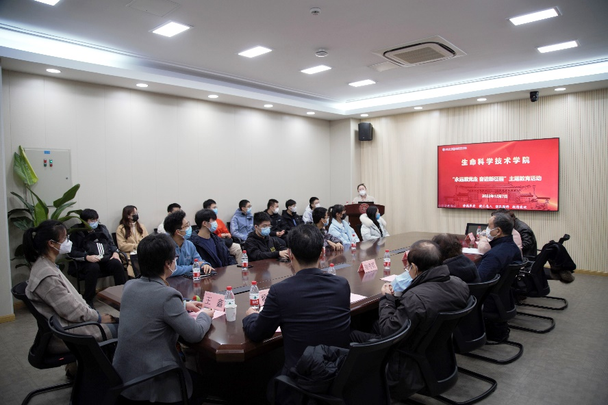 为深入学习宣传贯彻党的二十大精神,进一步引导青年学生坚定不移听党话、跟党走,立志做有理想、敢担当、能吃苦、肯奋斗的新时代好青年,2022年12月7日下午,生命科学技术学院开展“永远跟党走 奋进新征程”主题教育活动。学院关工委分会成员罗九甫、陆秀英、姜宗来、王莲芸,院党委书记顾建平、副书记李文纯、王鑫受邀出席,思政教师、辅导员及2022级新生入党申请人、预备党员代表参加活动。活动由学生办主任刘燕芳主持。