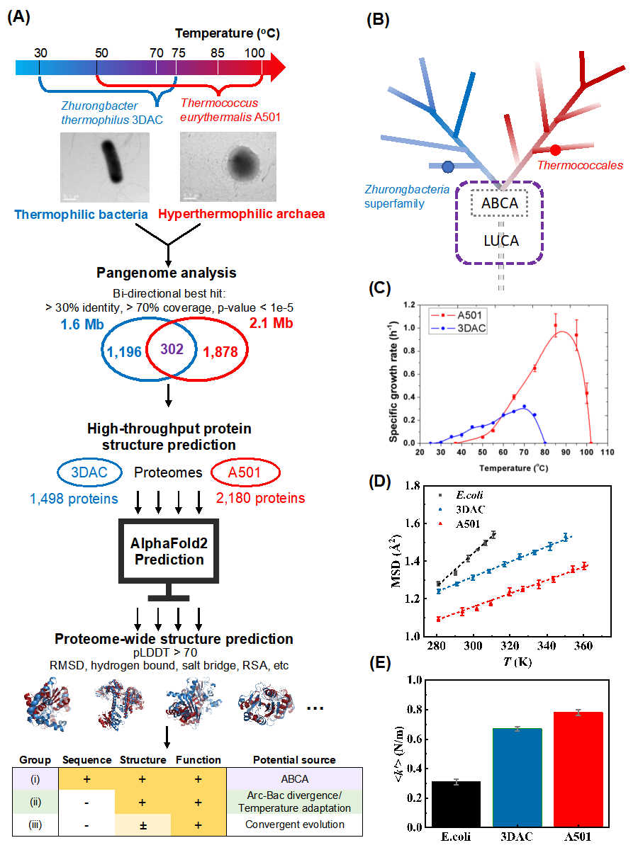 以现有生命追溯、重建演化过程和早期生命形式是研究生命起源和演化的一种重要思路。通常,研究者会基于基因组比较来推测早期生命的代谢特征,但高可变的基因组往往难以清晰地揭示演化脉络和模式。本研究独辟蹊径,应用基于高通量AlphaFold2深度学习技术,预测了近万个蛋白分子的3D结构,引入蛋白结构组,对深海热液来源的具有相似代谢功能的古老的超嗜热古菌和嗜热细菌的代表菌株,通过对序列、结构、功能三方面进行比较分析,重构了古菌细菌共同祖先的代谢特征。令人惊奇的是,这些结构在古菌细菌中保守的代谢模块,与实验验证的前生命化学过程高度重合,这一发现为生命起源的研究提供了新视角和新方法。此外,通过中子散射实验对本研究中不同菌种的柔性系数做了定量表征,在不同生长温度范围的古菌和细菌中建立了宏观柔性和其耐热能力的关系。