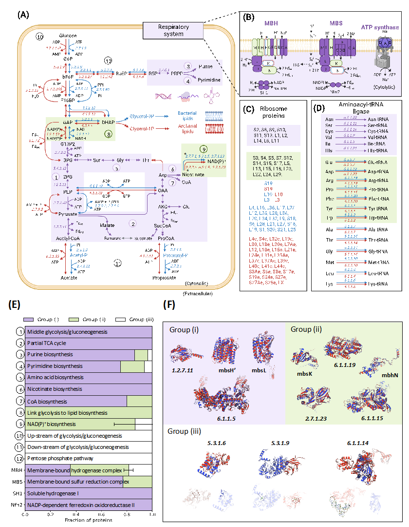 进一步对保守蛋白结构分析揭示了细菌和古菌共同祖先(ABCA)的保守代谢模块。这些保守的代谢模块包括糖酵解的中半部分(从 DHAP 到乙酰辅酶 A)、嘌呤和嘧啶的生物合成、一些必需氨基酸(即 Asp、Glu、Ser、Gly 和 Thr)的代谢、一些必需辅因子的生物合成(即 NAD( P)+ 和 CoA)、具有 MBH 和 MBS 的能量呼吸、大多数氨酰-tRNA 连接酶和部分核糖体蛋白等,推测它们本就存在于共同祖先ABCA中,而后被遗传给了细菌和古菌。