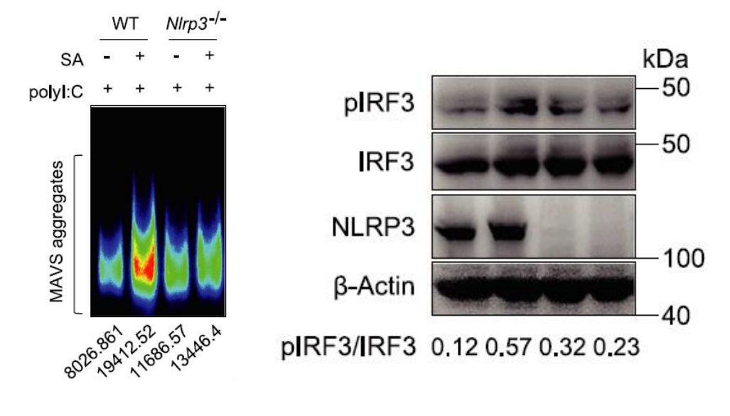 最后,研究人员用一系列体内和体外实验探究了乙酸盐增强IFN-I诱导的分子机制,结果显示:乙酸钠是通过MAVS-TBK1-IRF3信号轴增强IRF3的磷酸化(pIRF3)而增强IFN-I产生的(下图f-l),在此过程中,NLRP3桥接GPR43促进MAVS寡聚(下图左、右和模式图)。