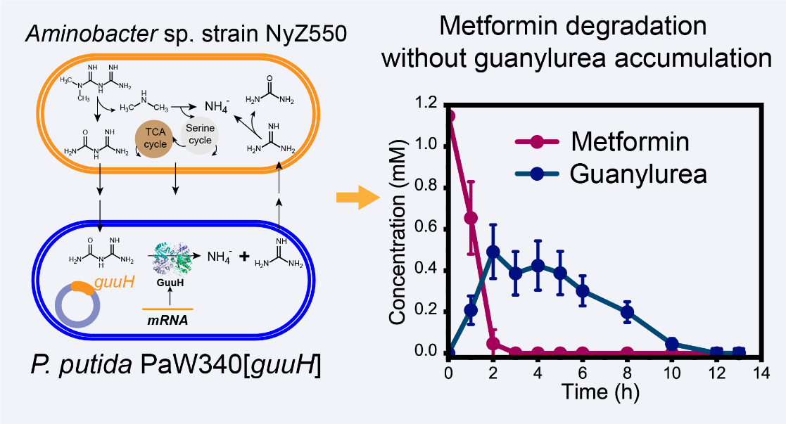 之前的报道以及本研究的结果都发现胍基脲是二甲双胍在环境中降解的“死产物”。为了将胍基脲完全降解以消除其在环境中积累带来的潜在风险,本研究利用Aminobacter sp strain NyZ550与表达胍基脲水解酶的Pseudomonas putida PaW340的混合菌群将二甲双胍和胍基脲完全降解(图2),研究结果为二甲双胍污染环境的生物修复提供了一种潜在的策略。