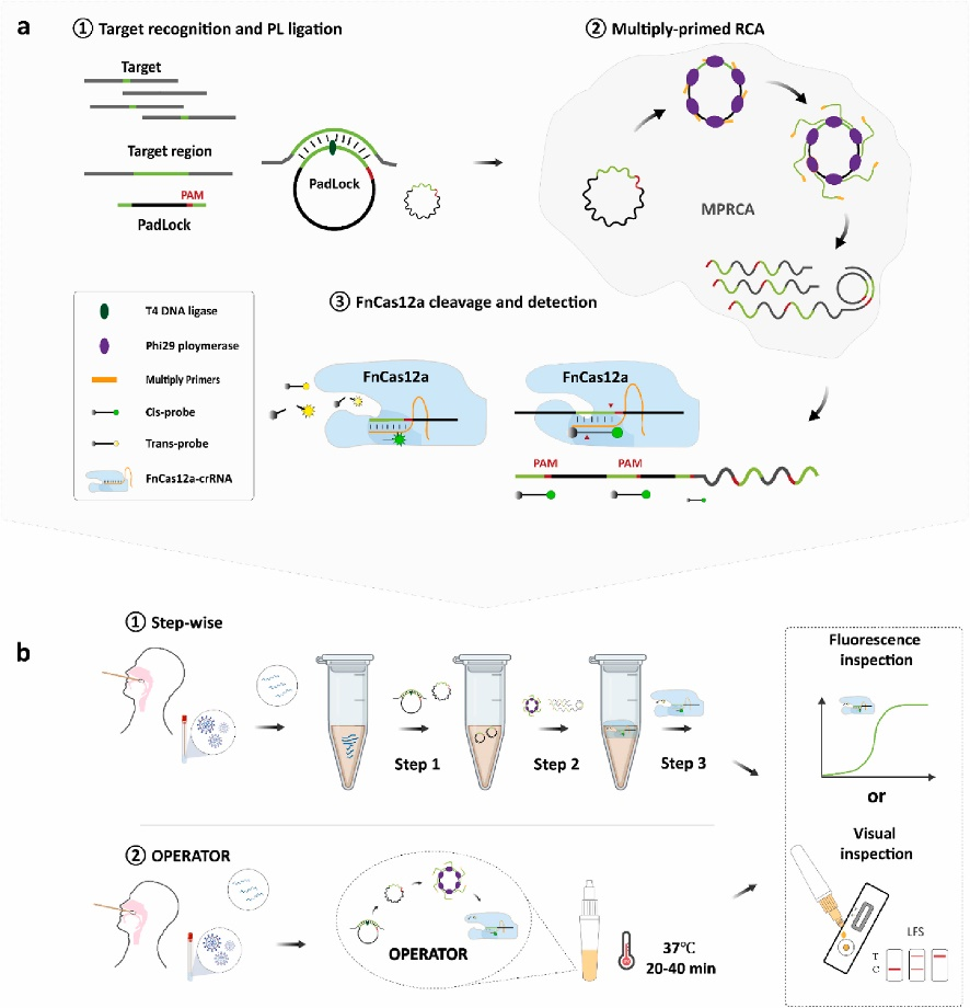 新型冠状病毒(SARS-CoV-2)爆发以来,在全球范围内感染了数亿人,夺去了数百万人的生命,对全球公共卫生和社会经济活动造成巨大影响。目前,新型冠状病毒的临床诊断方法,主要是逆转录荧光定量PCR法(RT-qPCR)和免疫试纸条学。RT-qPCR法需要昂贵的仪器设备且检测周期较长,难以满足快速、便携、在线检测的需求。本研究从头设计了针对RNA病毒的RNA分子信号转换、等温扩增和信号放大识别模式,开发了一种RNA分子免逆转录的一锅式滚环扩增技术辅助的CRISPR/Cas12a检测方法(OPERATOR,原理如图1所示)。OPERATOR成功将靶标-锁匙探针连接、多重扩增、CRISPR/FnCa12a体外剪切多部反应整合到单管一步反应,实现了环化、扩增以及剪切的一体化。