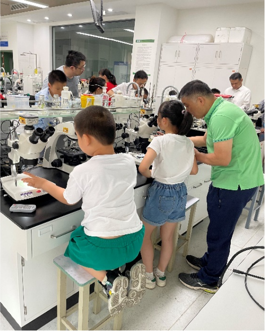 接着,秦敏君为孩子们讲解了果蝇与诺贝尔奖的故事,并指导孩子们在显微镜下观察果蝇。曹阳指导孩子们使用显微镜观察植物叶片和细胞形态。孩子们通过显微镜观察植物和动物,对微观世界和显微镜的使用有了更加直观的了解和认识。