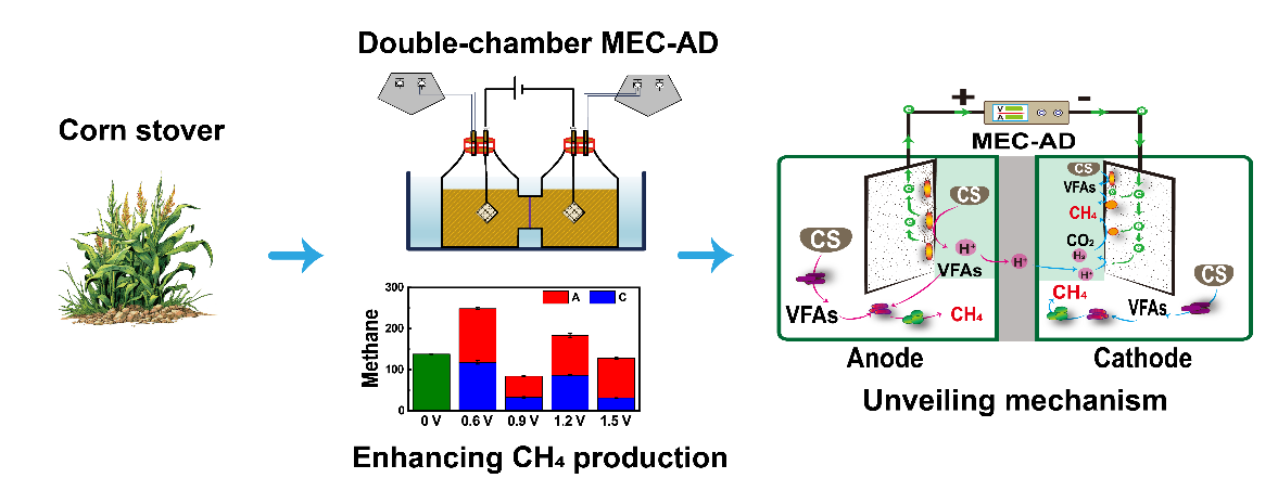 图1. 双腔电化学厌氧系统(MEC-AD)提升秸秆废水厌氧消化性能及其机理解析