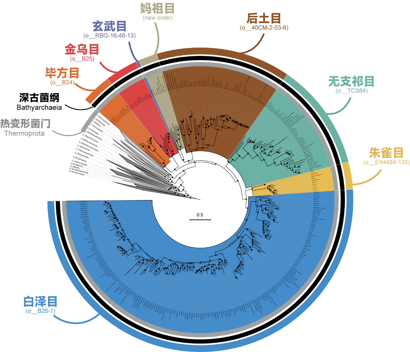 图1 新提出的深古菌物种分类系统(不同颜色表示不同目分类单元)
