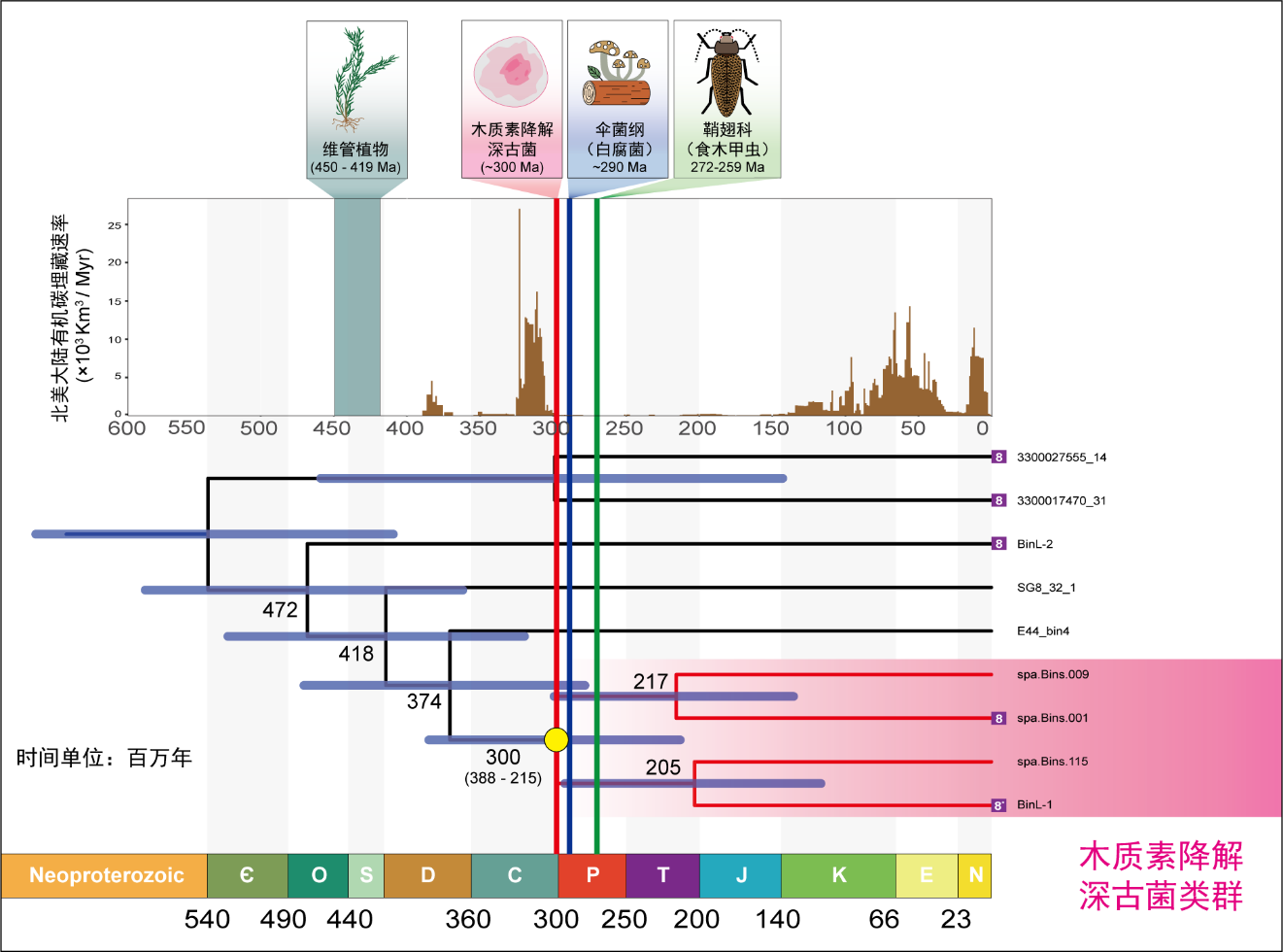 图2 木质素降解深古菌类群、白腐菌和食木甲虫的起源时间与石炭纪末期的碳埋藏速率