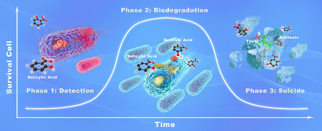 环境污染的生物治理集中在三个方面:污染物的检测、降解以及菌株的生物安全保障,合成生物学的出现为解决这一系列问题提供了新思路,一批功能模块、综合工具箱和系统被设计出来。然而,功能弱化和分散的模块由于需要复杂的控制条件从而阻碍了合成生物学应用于环境污染的治理。为了应对这一挑战,作者组装了一株三模块工程菌,它能够在6小时内检测水杨酸并输出一定量的荧光,随后在平台期早期开始将水杨酸降解为龙胆酸,最后在水杨酸耗尽时启动自杀回路。水杨酸,一种工业废水的典型污染物及多环芳烃降解的下游中心节点,被选作证明该设计的案例,所有任务被工程化菌株均在无外界干预的情况下按时间顺序完成(图1)。