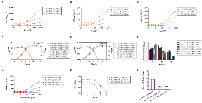 经过模块的逐步整合及针对退化的功能进行优化后,我们的整合菌株(Pfic-TAT(2)-P100-RBS35)可以在6小时内响应10–1,000 μM的水杨酸;在到达对数期后期时,平台期启动子开始转录nagAaGHAb以转化水杨酸为龙胆酸;最终水杨酸消耗殆尽,菌株激活自毁系统,生存率小于10-4(双模块菌株最高可达10-7)。此外,经过10代后,工程菌株功能的完整证明了该系统的长期稳定性。这项工作优化了每个单独模块,使其具有更强大的功能,同时利用逻辑门和时序控制元件对集成系统进行调节,解决了功能模块分散、效率低下的问题(图3)。