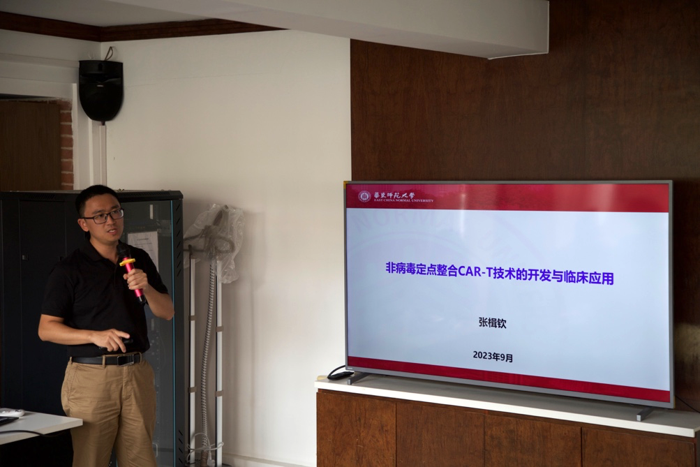 目前获FDA批准的CAR-T细胞疗法成本昂贵。在 CAR-T 细胞生产中病毒的使用以及随机整合CAR的策略使 CAR-T细胞的使用存在潜在的安全隐患。 在此次讲座中,来自华东师范大学生命科学学院的张楫钦研究员围绕“非病毒定点整合CAR-T技术的开发与临床应用”这个主题,讲述了他们团队成功运用CRISPR-Cas9 体系生成非病毒、基因特异性靶向的CAR-T 细胞,并在临床治疗中显示出优异的安全性和有效性。 此外,他们开发的一种整合PD1的创新型抗 CD19 CAR-T 细胞也在异种移植模型中展现出卓越的疗效。现场互动环节,参会者就“非病毒转染系统的转染效率”,“非病毒、基因特异性整合 CAR-T 细胞的成本”等问题与张楫钦研究员进行了深入交流。