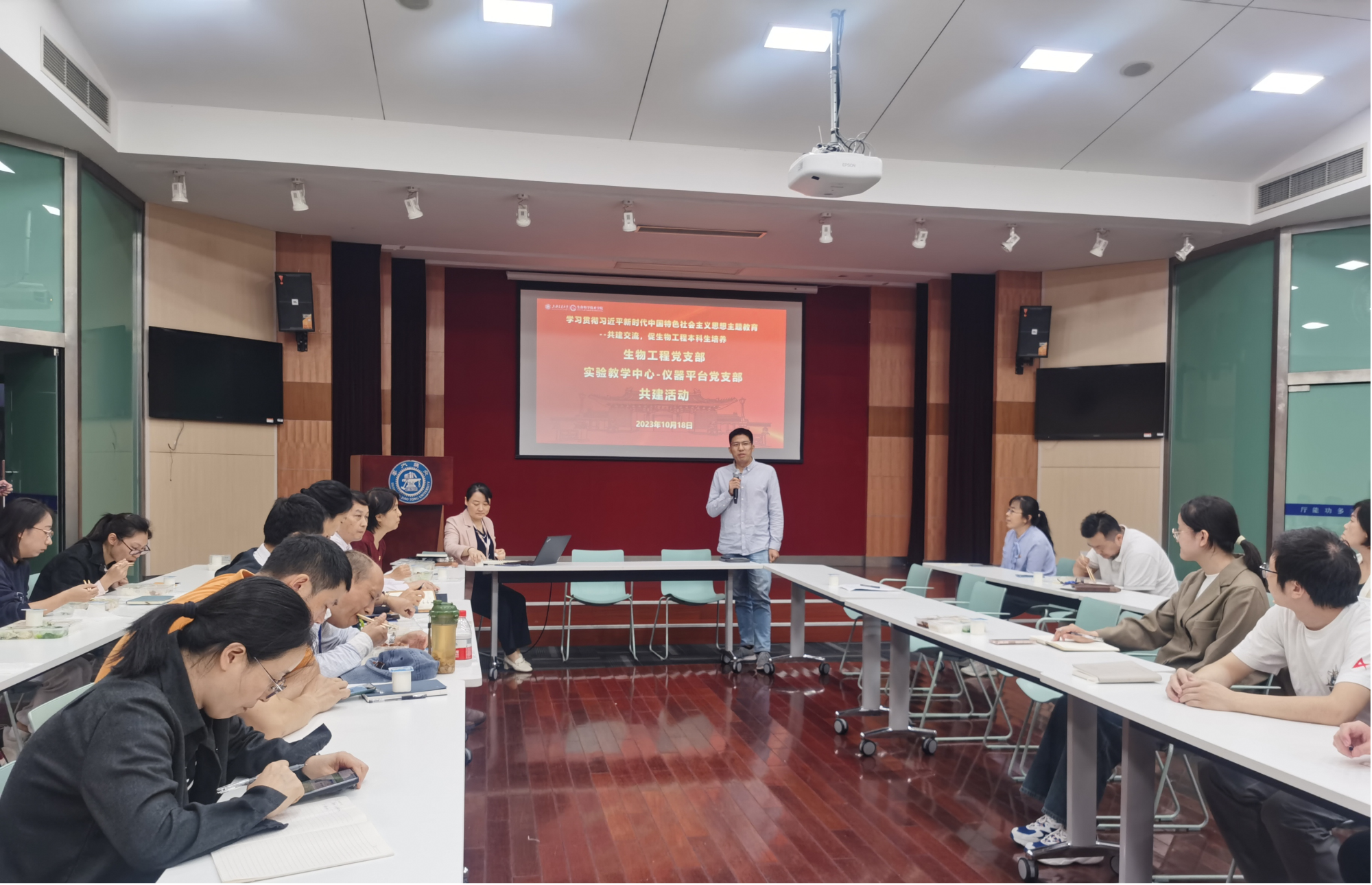 2023年10月18日,生命科学技术学院实验教学中心-仪器平台党支部与生物工程系教工党支部在生物药学楼树华厅开展主题为“共建交流,携手共促生物工程本科生培养质量”的主题党日活动。本次主题党日活动以“党建+生命学科创新人才培养”为切入点,围绕生物工程新工科人才培养、生物工程课程探讨、生命科学竞赛等主题开展研讨。学院党委委员、实验教学中心主任张雪洪,实验教学中心-仪器平台党支部书记张萍,生物工程系教工党支部书记陶飞,以及两个支部党员共计三十人余人参加,活动由陶飞主持。