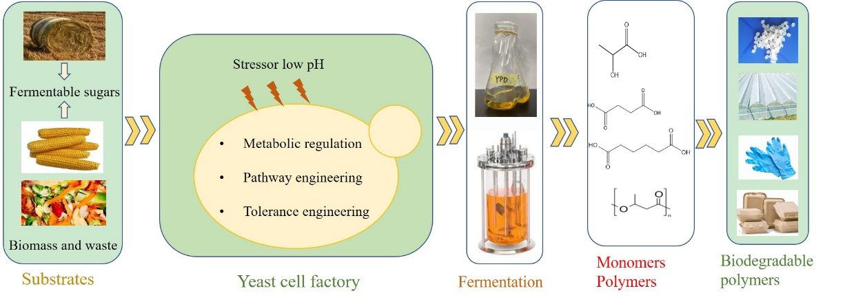传统塑料制品由于难以在环境中降解,造成了严重的环境污染,近年来,生物降解塑料由于其环境友好的独特优点而受到越来越多的关注。可生物降解塑料可广泛用于食品、农业、工业、医药等领域,然而,其高生产成本是限制其商业化和应用的瓶颈。酵母菌与细菌相比,能耐受低pH和高温等外界胁迫,还具有安全性鲁棒性等优点,尤其是酵母菌可以利用木质纤维素等生物质,因此被广泛用于生物合成的细胞工厂。该论文系统综述了常用四种生物可降解塑料聚乳酸(PLA)、聚羟基烷酸酯(PHA)、聚丁二酸丁二醇酯(PBS)以及聚己二酸对苯二甲酸丁二醇酯(PBAT)利用酵母细胞生产塑料或者单体有机酸的生物合成技术及策略,并对该领域的未来发展方向进行了展望。