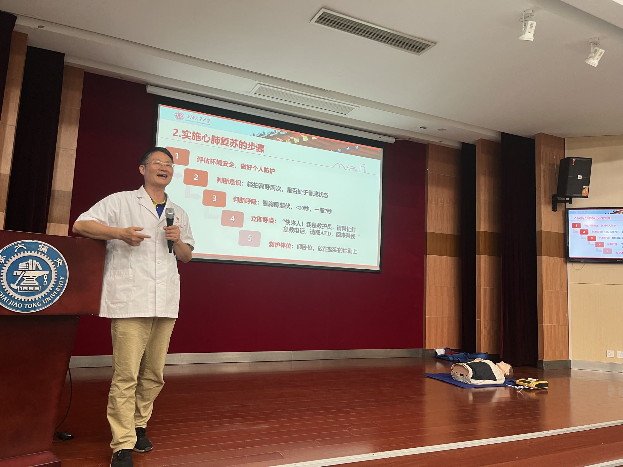 刘金生作“新生医疗安全培训”专题培训,向同学们详细介绍了救护新概念,并展示了心肺复苏术,现场指导新生们借助模型进行了模拟实践,师生互动气氛活跃。
