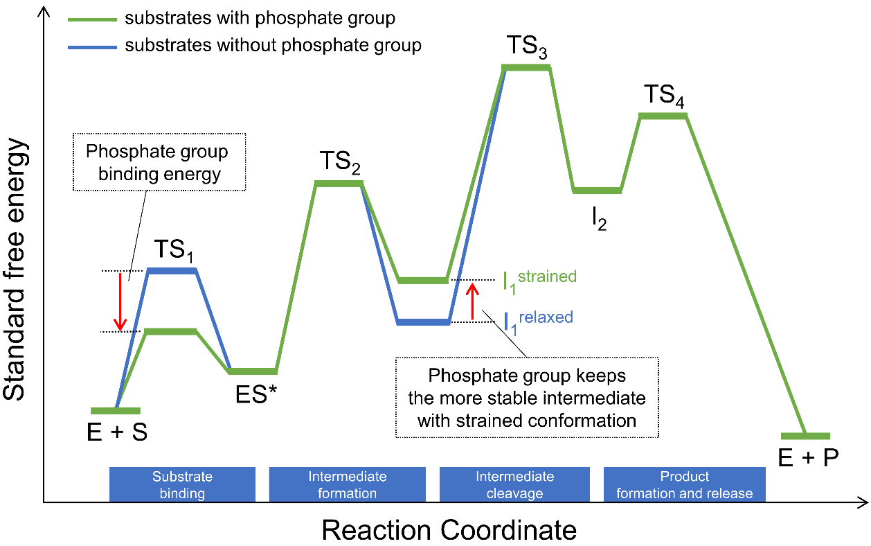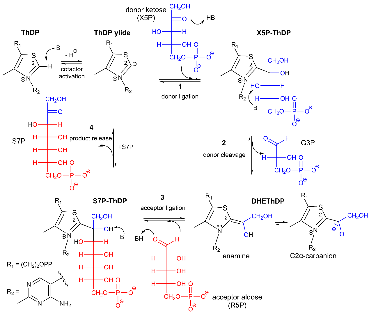 磷酸基团是能量分子ATP和代谢途径中间体化合物的通用基团,而大自然为什么选择磷酸基团,一直是学术界关注的焦点问题。转酮酶(TK)是磷酸戊糖途径和卡尔文循环中的关键酶,可逆性催化供体磷酸酮糖到受体磷酸醛糖的2碳单元转移。转酮酶反应机理可概括为:(1)供体底物X5P与辅酶ThDP的共价结合;(2)底物C3-OH的去质子化导致C2-C3键断裂和第一产物释放;(3)烯胺中间体与受体底物R5P反应形成下一个共价中间体S7P-ThDP;(4)S7P-ThDP共价键断裂和产物S7P释放(图1)。