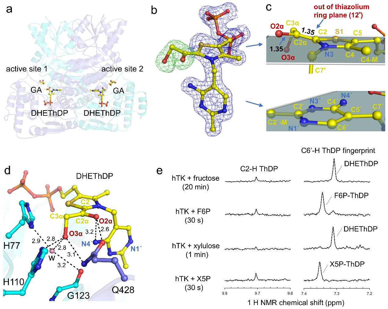底物的磷酸基团通常不直接参与酶催化,但在底物结合和识别中发挥重要作用。为了理解底物磷酸基团在转酮酶催化中的作用,我们分析了磷酸化底物(X5P和F6P)和去磷酸化底物的晶体结构特征。其中,hTK与木酮糖5-磷酸形成X5P-ThDP共价中间体结构(图2),磷酸基团与周边残基相互作用;去磷酸基团后,该加合物在C2-C3键裂解,形成DHEThDP中间体,DHE部分与活性位点残基如His77、H110、Gly123和Gln428形成氢键(图3)。通过分析捕获的DHEThDP中间体的键长/键角和构型,发现C2-C2α键(1.35Å)明显短于典型的C-C单键(1.51Å),但与典型的C-C双键(1.34Å)非常相似。其次,这种键与噻唑环不在统一平面内,表现出约13°的平面外畸变。前期研究表明,Breslow中间体具有高度反应性,可以很容易地质子化、脱水或氧化。当与天然底物反应时,Breslow中间体不会在TKs中积累,而是作为与酮糖底物的共价偶联物保持在“稳定储存”状态。这可以最大限度地降低副反应,可能是控制碳阴离子/烯胺中间体在酶催化中反应性的一种策略。基于NMR进行了反应中间体分析,发现反应平衡已经从对天然底物观察到的供体-ThDP共价中间体转移到DHEThDP烯胺中间体。