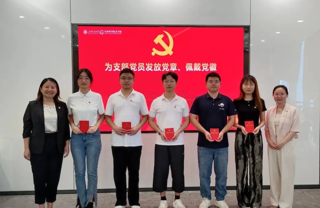 张燕红带领全体党员重温入党誓词,并为其发放党章、佩戴党徽。