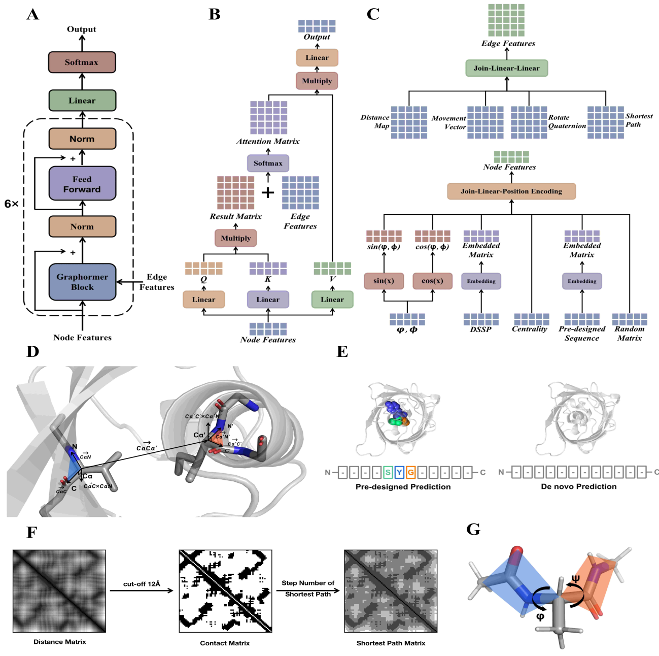 近日,上海交通大学生命科学技术学院陈海峰教授课题组与冯雁教授课题组合作在中科院Top期刊《Briefings in Bioinformatics》在线发表题为Graphormer Supervised De Novo Protein Design Method and Function Validation的研究成果,该研究开发了一种原创而高效的全新蛋白序列设计方法GPD(图1所示),该方法与当前的SOTA方法proteinMPNN相比,序列多样性显著更高,生成速度快2.2倍,能够显著提升工业酶及蛋白质药物的从头设计能力。生命科学技术学院本科生穆俊羲为第一作者,博士生李政新、本科生张博、博士生张琦为共同第一作者,生命科学技术学院陈海峰教授、冯雁教授以及魏婷助理研究员为共同通讯作者。