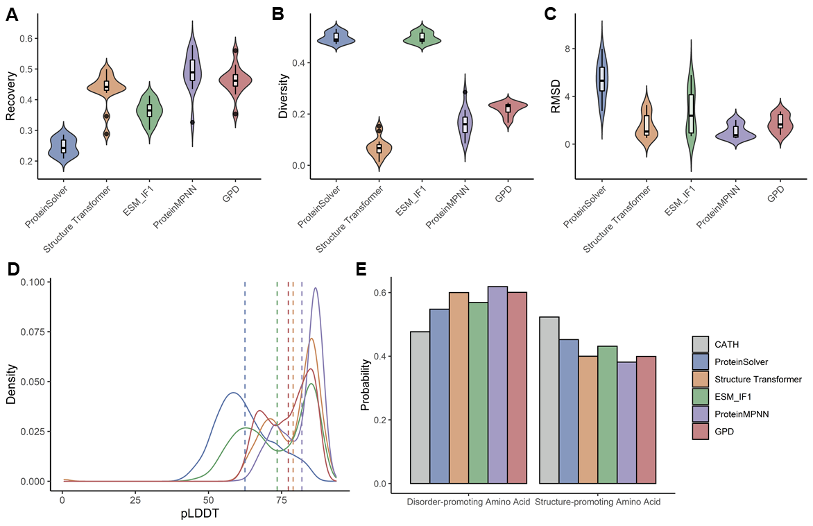 陈海峰课题组首先评估了GPD的序列设计质量,发现其能够设计生成更合理的蛋白序列,并且保有较高的序列多样性,同时多数设计的序列都能够在结构预测模型中折叠为所需的结构。图3中展示了GPD在序列可折叠性、序列同源性,以及序列多样性方面总体优于现有模型。