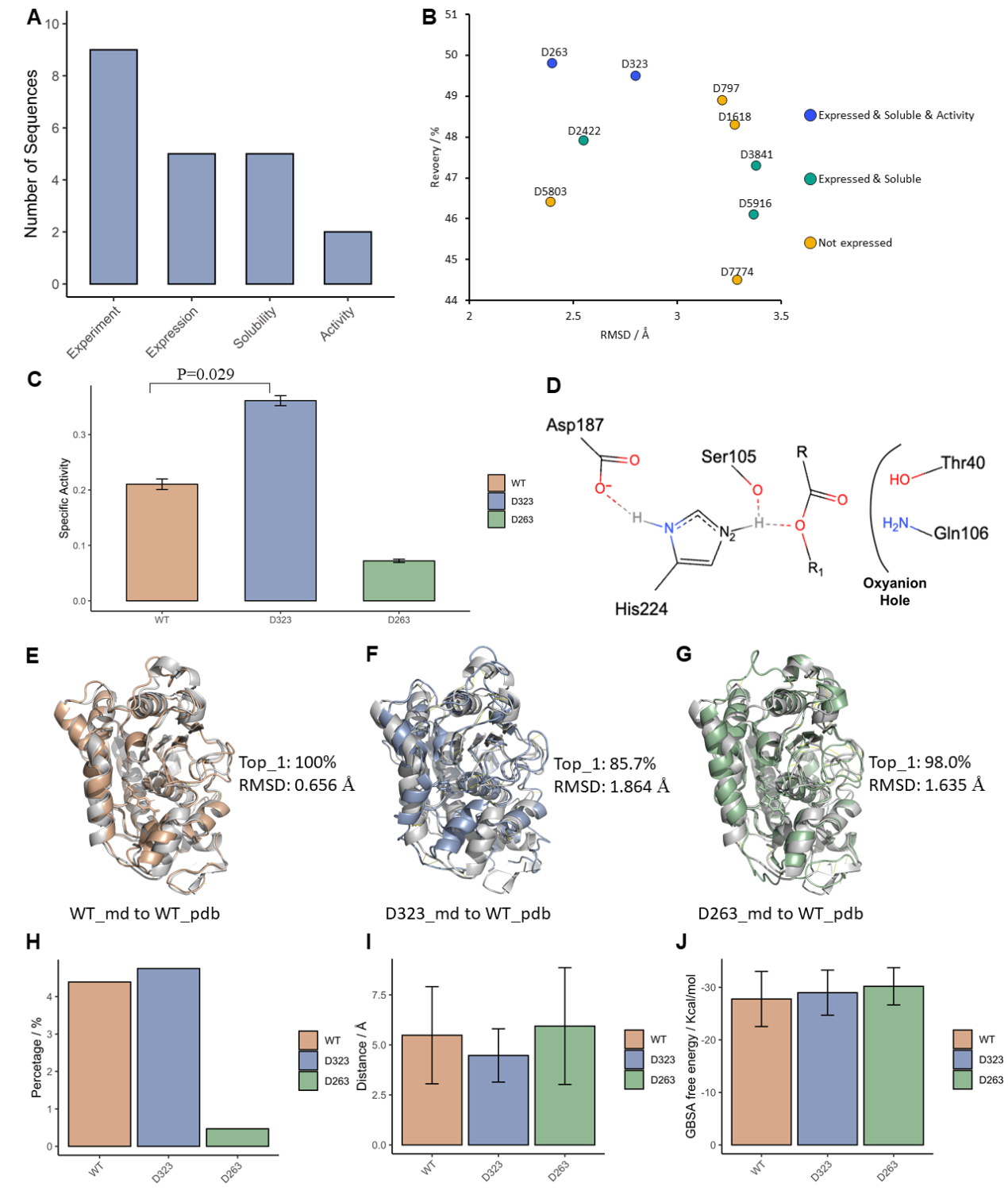 然后陈海峰组与冯雁组合作,将GPD应用到南极假丝酵母酯水解酶(CALB)的重设计上,图4展示了设计的结果:设计并筛选了9条序列,其中便有一条酶活达到原来的1.7倍。实验的结果说明GPD的设计具有合理性,同时效率高于之前的理性设计或定向进化方法。
