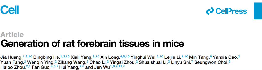2024年4月25日,美国得克萨斯州西南医学中心吴军团队、中科院脑科学与智能技术卓越创新中心(中科院神经所)杨辉/周海波团队和中科院动物所郭帆团队合作在Cell杂志发表题为Generation of rat forebrain tissues in mice的文章。该研究展示了一种优化的囊胚互补技术,利用该技术研究者筛选出了支持前脑囊胚互补的基因Hesx1,并成功在小鼠体内生成了功能性大鼠前脑组织。异种前脑互补为研究大脑发育以及认知功能机制在进化上的保守和差异性打开了大门。优化的囊胚互补策略具有极大的潜力,可以拓宽异种器官生成的研究和应用。