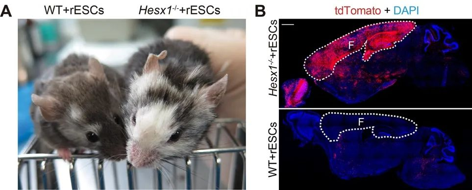 为了确定是否可以通过CCBC在小鼠中生成大鼠前脑组织,研究者将大鼠胚胎干细胞(Rat embryonic stem cells,rESCs)注入到Hesx1-/-小鼠囊胚中。在出生的417只Hesx1-/- +rESCs嵌合体中,401只为部分前脑重构(96.16%),16只为完全前脑重构(3.84%)(图1A)。研究者发现,在Hesx1-/- +rESCs嵌合体中,tdTomato+细胞的比例在皮层和海马区比其他脑区和其他组织更高(图1B)。