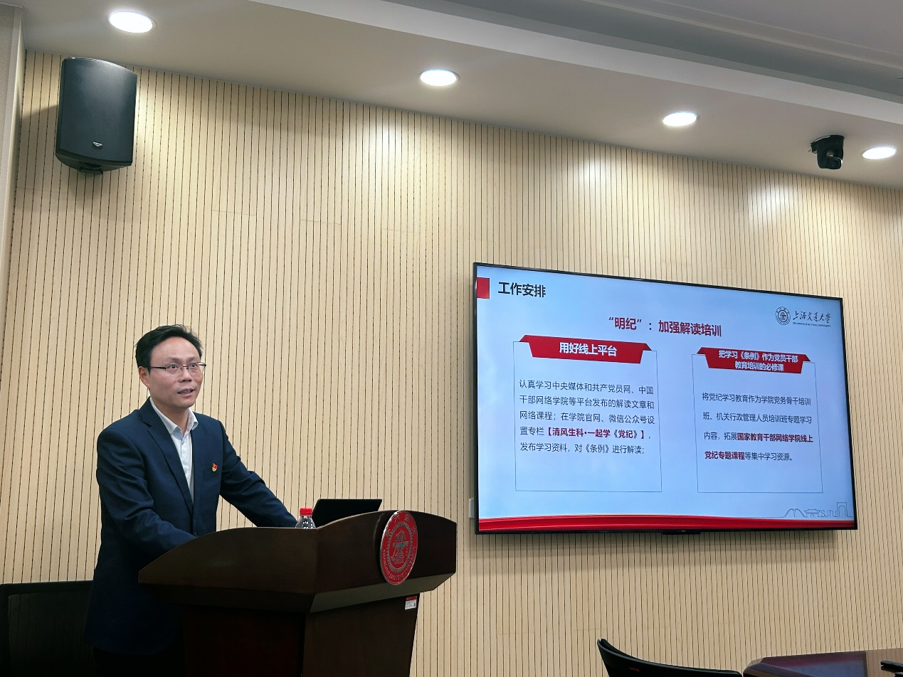 王光艳对《中国共产党纪律处分条例》进行学习解读,系统梳理了《条例》的制定及历次修订情况,修订要点和主要内容,结合教育系统违纪典型案例深入剖析了违反六项纪律的行为,并与大家分享了《条例》学习的体会与思考:党纪学习教育要坚持以学铸魂、以学修身、学以致用、学以明志,时刻以党员标准严格要求自己,牢固树立纪律规矩意识,永葆共产党人的政治本色。本次辅导报告对学院党员干部更加深入学习贯彻《中国共产党纪律处分条例》的丰富内涵和实践要求起到重要的指导作用。