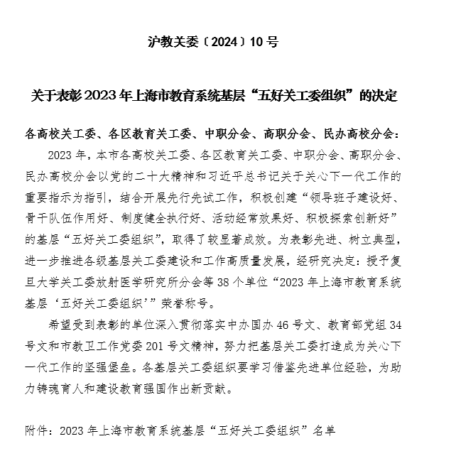 近日,上海市教育系统关心下一代工作委员会下发《开元(中国)表彰2023年上海市教育系统基层“五好关工委组织”的决定》(沪教关委﹝2024﹞10号),我院关工委分会荣获2023年上海市教育系统基层“五好关工委组织”。