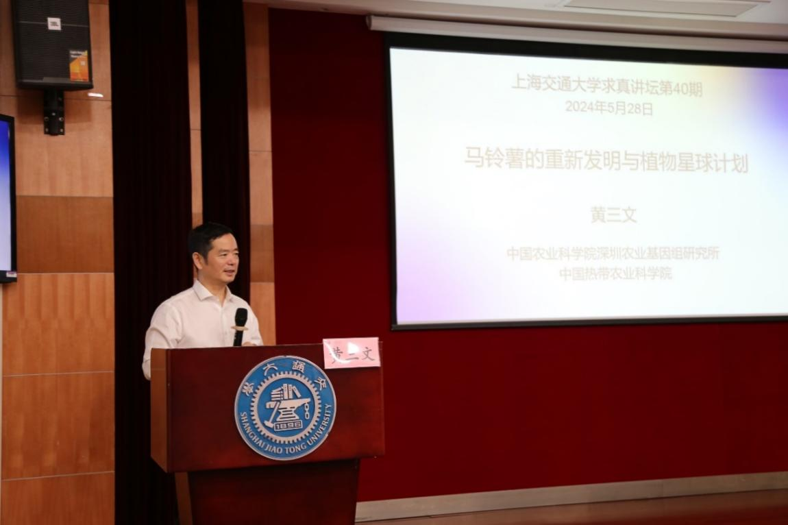 5月28日上午,中国科学院黄三文院士应邀做客第40期求真讲坛,做题为《马铃薯的重新发明与植物星球计划》的主题报告。中国科学院院士韩斌,上海交通大学生命科学技术学院院长张雁、党委书记顾建平、原院长冯雁出席了本次讲坛。讲坛由生命科学技术学院副院长林双君教授主持。