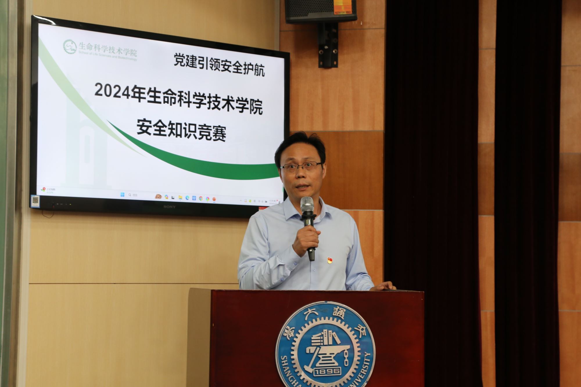 在第23个全国“安全生产月”之际,为庆祝中国共产党成立103周年,深化党建与事业融合,聚力推动安全责任机制落实,强化党组织的组织保障和党员干部示范带头作用,激发全员参与安全工作的活力,生命科学技术学院于6月26日在生物药学楼树华多功能厅 举行“党建引领 安全护航”安全知识竞赛。校实验室安全与环保中心副主任彭华松受邀出席,院长张雁,党委书记顾建平,党委委员、副院长张晓君,副书记王鑫,党委委员、生物工程系主任白林泉,Bio-X研究院副院长、党支部副书记李兴旺及各教工党支部书记出席活动,来自各单位的师生代表组成7支队伍参加此次竞赛。