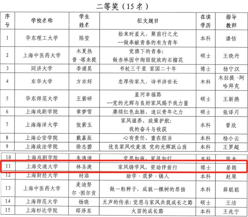 经市学生事务中心组织专家集中评审,我院博士生林圣庚同学的《家风铸学风,资助伴前行》,指导教师晏筠,荣获高等教育类二等奖。