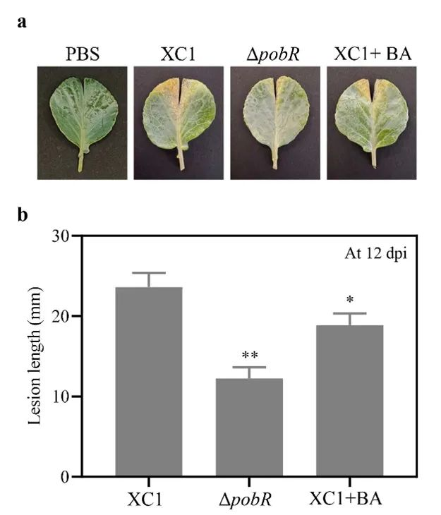 图7 100 μM BA处理降低了XC1对甘蓝的致病力
