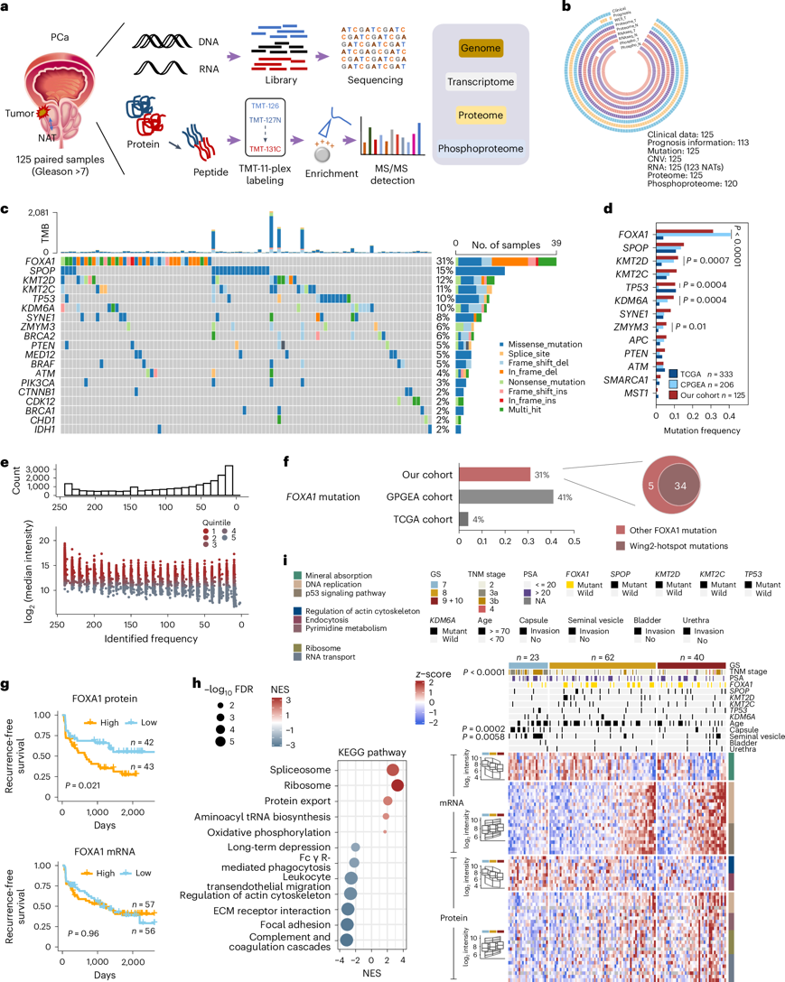 前列腺癌(PCa)呈现出东西方人群基因组层面的差异性,这反映在癌症基因组和疾病进展的不同变化中。在本项工作中,研究人员针对125例癌和癌旁配对的临床原位高危前列腺癌样本进行了蛋白基因组学的全景解析,以增强对于高危前列腺癌预后,诊断和治疗的理解。针对不同预后特征的分子亚型,揭示关键的致癌磷酸化事件,以及探索精准诊断和预后的生物标志物。基于蛋白质组学的分子分型,研究人员发现预后最差的S-III亚型中代谢信号和癌症通路则更加显著地被激活,进一步的机制解析发现支链氨基酸代谢途径关键酶BCAT2的高表达提高了癌组织对于支链氨基酸的利用,促进了前列腺癌的增殖。基于磷酸化组学的全景分析,研究人员确定了FOXA1 S331磷酸化修饰能促进下游AR信号通路的活化过程。而抑制FOXA1-S331磷酸化修饰水平则能够减缓前列腺癌的进展过程。此外,基于蛋白质组学和临床数据的整合分析,研究人员发现GOLM1可以作为一种潜在生物标志物,用于诊断PSA(前列腺癌特异性抗原)“灰区”的前列腺癌患者。研究表明,与PSA相比,血清GOLM1具有更高的特异性、更低的灵敏度和更高的准确性。