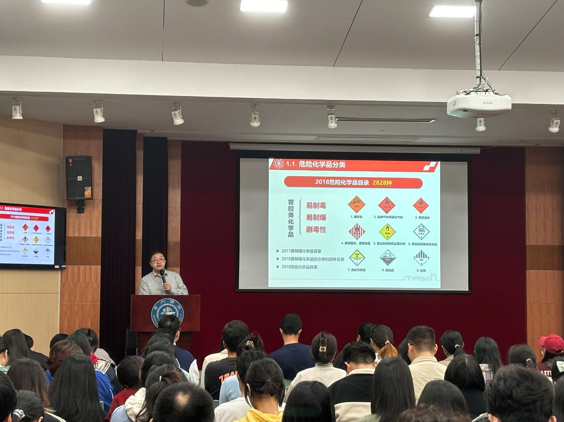 资产管理与实验室处刘闯作“化学品安全管理培训”,介绍了危险化学品分类及特性,危险化学品安全管理规范,常见危化品存放隐患,各类试剂柜的正确使用要求。并强调师生都应提高安全意识,掌握危险源管理要点,在实验中注重个人防护。