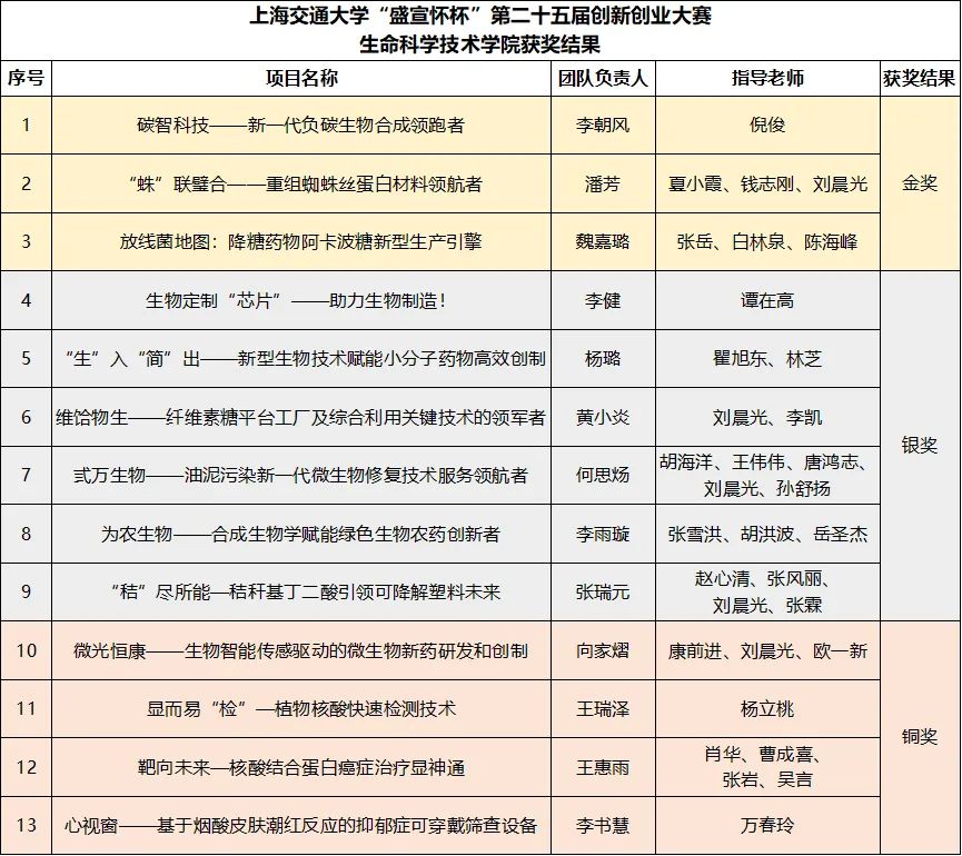 今年,生命科学技术学院师生团队在中国国际大学生创新大赛(2024)系列赛事中表现出色,屡创佳绩。在上半年举办的上海交通大学“盛宣怀杯”第二十五届创新创业大赛中,学院共计20支项目团队参赛,经专家网评、复赛、决赛,共有13支团队取得3金6银4铜的好成绩。