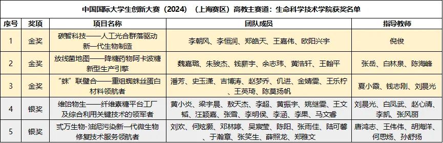 其中,“碳智科技——人工光合群落驱动新一代生物制造”项目以小组第一身份晋级市赛排位赛,并获得国赛参赛资格,最终代表学校与学院在国赛中摘得金奖。