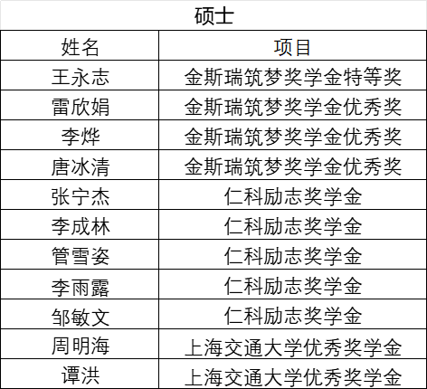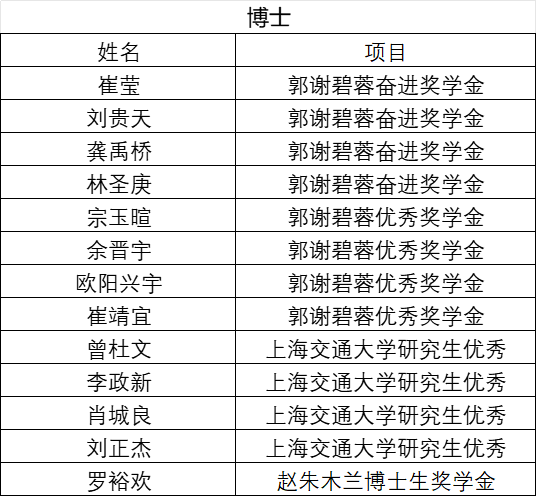 根据上海交通大学2024年度秋季专项奖学金、上海交通大学研究生优秀奖学金评审通知,按照《生命科学技术学院研究生奖学金评审办法》,经由研究生奖学金评审工作小组评审,现将结果公示如下: